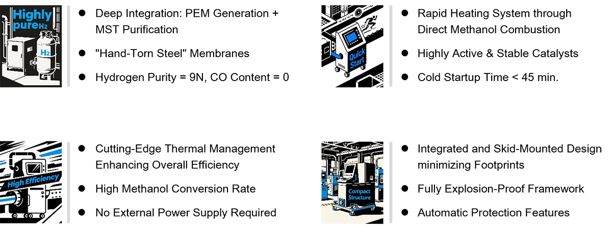 TheZQ-UPHG-MSRseries integrates hydrogenproduction (based on MSR methanol reforming) and anadvanced purification process (utilizing Sino-Hydrogen'sproprietary Metal Membrane Separation Technology).Unlike conventional pressure swing adsorption (PSA)methanol reforming systems, this MSR series, thanks tothe advantageousMSTprocess, allows the directinjection of raw hydrogen at high temperatures andpressures into the membrane purification process. Thisdesign eliminates the need for water condensation andseparation of the raw hydrogen and offers the highestresistance to CO-poisoning. The ZQ-UPHG-MSR seriesfeatures high process integration,compact footprint, lowenergy consumption, and rapid system startup.